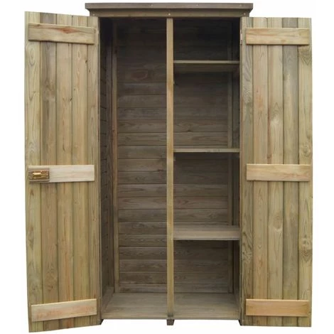 Unser Holz-Lagerschuppen strahlt einen rustikalen Charme aus und ist eine praktische Erganzung fur Ihre Terrasse, Ihren Garten oder Ihren Hinterhof. Mit 3 Regale und einem groBen Fach bietet der Gartenschuppen ausreichend Platz fur die Organisation von Werkzeugen, Gartengeraten und mehr. Dieser AuBenschrank besteht aus Kiefernholz, das umweltfreundlich ist. Das impragnierte Kiefernholz ist strapazierfahig und witterungsbestandig. Daruber hinaus ist das Dach mit einem wasserfesten Teerpapierfilz ausgekleidet. Dieser Holzschrank ist einfach zu montieren. Bitte beachten Sie, dass Holz ein Naturprodukt ist und UnregelmaBigkeiten aufweisen kann.