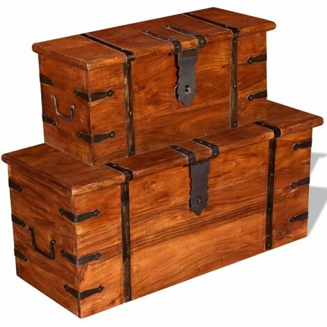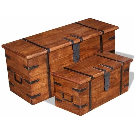 Dieses einzigartige Aufbewahrungstruhen-Set, das aus Massivholz mit Honig-Finish gefertigt ist, wird Ihr Zimmer großartig ergänzen. Die Holztruhen bieten ausreichenden Stauraum für Kleider, Zeitschriften, Bücher, Spielzeuge, Werkzeuge und anderes Zubehör. Sie verfügen über Riegel vorne und zwei seitliche Griffe. Dank ihrer stabilen und flachen Oberseite können diese Holzboxen auch als Couchtische, Kaffeetische, Wohnzimmertische, Seitentische, Beistelltische, usw. eingesetzt werden. Die Aufbewahrungstruhen sind aus Massivholz handgefertigt und weisen die Merkmale von Palisander und Rosenholz auf. Jedes Möbelstück ist dank der exzellenten Handwerkskunst und der schönen Holzmaserung einzigartig und unverwechselbar. Der Lieferumfang umfasst 2 Aufbewahrungstruhen. Wichtige Anmerkung: Farben können von Produkt zu Produkt variieren, jede Aufbewahrungstruhe wird somit einzigartig; die Lieferung erfolgt zufällig.