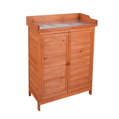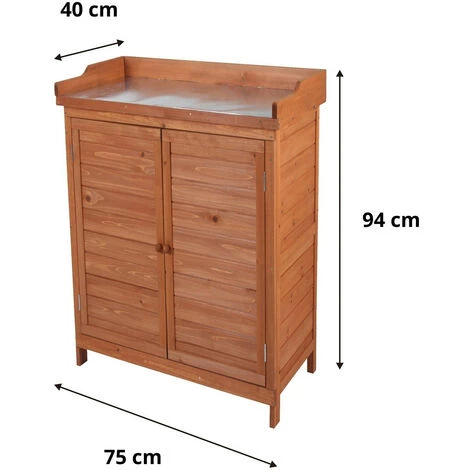 – äußere Abmessungen: 75x40x94 cm. Maße zwischen den Regalböden: 29 cm und 30 cm. – Material: Tannenholz und verzinkte Stahlplatte. – Art der Tür: Doppelflügeltür. – Gewicht: 14 kg. Gewicht der Einlegeböden: 15 kg und der Arbeitsplatte: 30 kg. – Pflege: Leicht mit einem feuchten Tuch zu reinigen. – Bedeckung: einfach wasserdicht. – Dicke der Holzplatten: 10 mm.