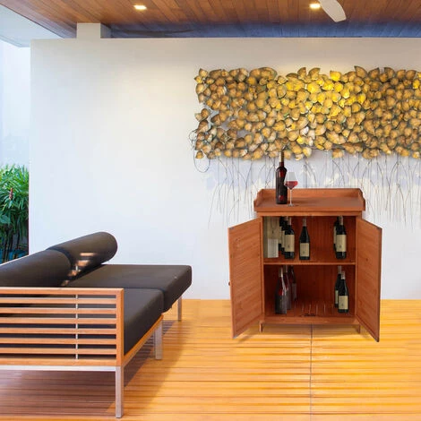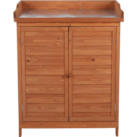 Schrank aus Fichtenholz für den Innen- und Außenbereich mit umweltfreundlicher Farbbehandlung. Hergestellt aus Holz aus nachhaltiger Forstwirtschaft und FSC-zertifiziert. Der Zugang zum Innenraum erfolgt über zwei Flügeltüren, und die Arbeitsplatte ist aus verzinktem Stahl gefertigt, um die Stabilität zu erhöhen. Er hat 2 Bereiche: Sie können Ihre Getränke, kleine Gartengeräte oder Reinigungsmittel aufbewahren.