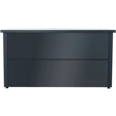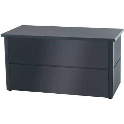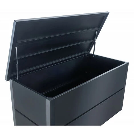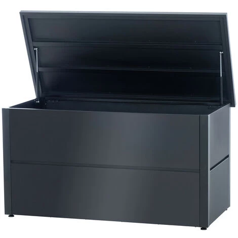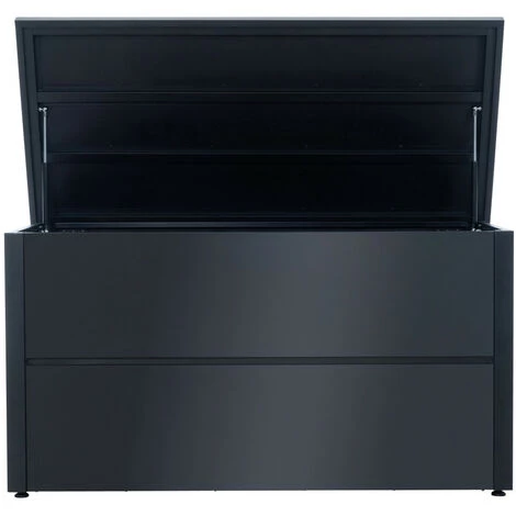 Die Aufbewahrungsbox Abilene ist eine edle und funktionale Truhe für Ihre Gartentextilien. Die Box ist aus schwarz beschichtetem Edelstahl gefertigt und schützt die Gartenmöbel vor Witterungs- und Korrosionsschäden. Dank der verarbeiteten Materialien ist diese Gartenbox besonders robust und langlebig. Für die praktische Unterstützung und ein einfaches Handling sorgen am Deckel die beiden Gasliftdämpfer – diese garantieren ein sanftes Öffnen und Schließen. Des Weiteren hat die Auflagenbox vier verstellbare Füße, um leichte Unebenheiten des Bodens ideal auszugleichen.