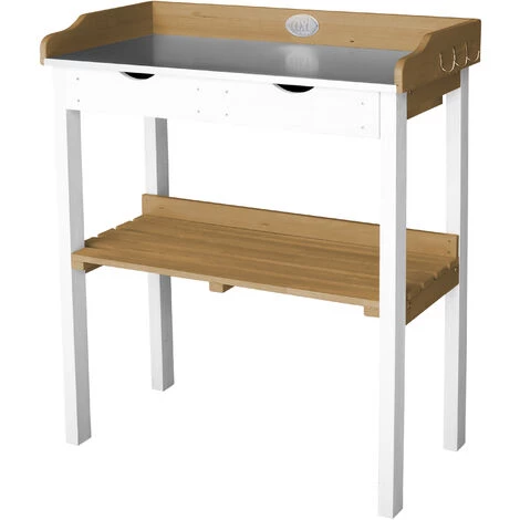 Der Pflanztisch in Braun und Weiß mit 2 Schubladen und Arbeitsplatte aus Zink von AXI ist eine praktische Ergänzung für jeden Garten oder Balkon. Das Umtopfen von Blumen und Pflanzen wird mit diesem praktischen Arbeitstisch zum Kinderspiel. Die Ablagefläche bietet viel zusätzlichen Stauraum für Pflanzen, Erde und Töpfe. Dank der beiden praktischen Schubladen lassen sich Gartenutensilien ordentlich aufbewahren. Darüber hinaus bietet die Hakenleiste mit 6 Haken die Möglichkeit, kleine Werkzeuge aufzuhängen. So haben Sie Ihre Gartenwerkzeuge immer griffbereit und herrscht Ordnung im Garten!