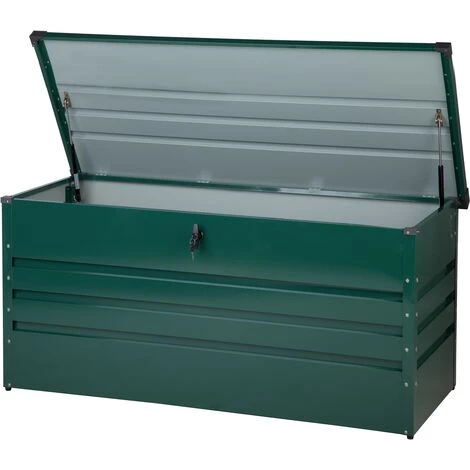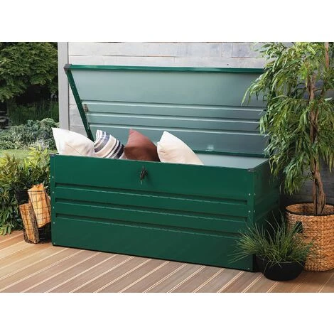 Wetterfeste, große Gartenkissenbox aus Metall in Dunkelgrün. In dieser hochwertigen, robusten verzinkten Stahltruhe finden Sie genügend Platz für all Ihre Garten-, Sport- oder Campingutensilien und schützen sie über das ganze Jahr vor jeglichen Wettereinflüssen. Der stabile, glatte Deckel lässt sich mit Hilfe des Drehgriff-Zylinderschlosses verschliessen und dank einer Gasdruckfeder leicht öffnen.