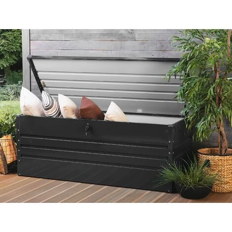 Wetterfeste, große Gartenkissenbox aus Metall in Graphitgrau. In dieser hochwertigen, robusten verzinkten Stahltruhe finden Sie genügend Platz für all Ihre Garten-, Sport- oder Campingutensilien und schützen sie über das ganze Jahr vor jeglichen Wettereinflüssen. Der stabile, glatte Deckel lässt sich mit Hilfe des Drehgriff-Zylinderschlosses verschliessen und dank einer Gasdruckfeder leicht öffnen.