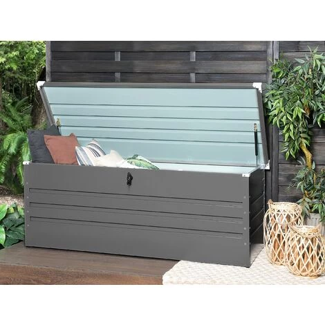 Wetterfeste, große Gartenkissenbox aus Metall in Grau. In dieser hochwertigen, robusten verzinkten Stahltruhe finden Sie genügend Platz für all Ihre Garten-, Sport- oder Campingutensilien und schützen sie über das ganze Jahr vor jeglichen Wettereinflüssen. Der stabile, glatte Deckel lässt sich mit Hilfe des Drehgriff-Zylinderschlosses verschliessen und dank einer Gasdruckfeder leicht öffnen.