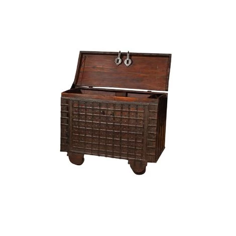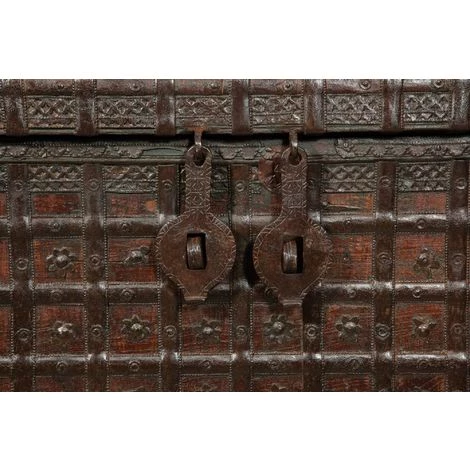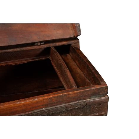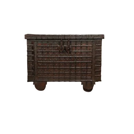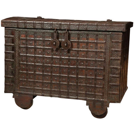 Koffer aus Holz und Eisen, 115 cm lang, 65 cm tief, 88 cm hoch. Sehr geräumig und leicht zu bewegen dank der vier Räder, die durch die Holzverkleidung geschickt verborgen sind. Doppelvorhängeschloss (nicht im Lieferumfang enthalten) und eiserne SeitengAlle Maße beziehen sich auf die maximale Größe des Artikels