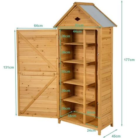 Der geräumige Gartenschrank mit Satteldach bietet viel Stauraum für alle gängigen Gartenutensilien. Auf der linken Seite befinden sich 5 Ablageflächen für kleinere Geräte. Auf der rechten Seite sind keine Regalbretter angebracht, um das Unterbringen von großen Harken oder ähnlichen Geräten zu ermöglichen. Der Schrank selbst besteht aus massiver Kiefer. Zum zusätzlichen Schutz vor Regen ist an der Dachspitze ein Zinkblech angebracht.