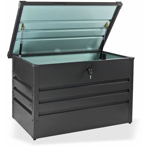 Die nützliche Metallbox ist die ideale Aufbewahrungsmöglichkeit für alle Utensilien in Haus und Garten. Ob Stuhlauflagen, Gartenaccessoires oder Kinderspielzeug – alles lässt sich einfach und sicher in der geräumigen und stabilen Box verstauen. Sie ist durch die positiven Materialeigenschaften sehr lange haltbar und praktisch wartungsfrei. Der leichtgängige, aufklappbare Deckel mit 2 Gasdruckfedern macht das Verstauen von Gegenständen einfach. Auch das vorhandene Knebelschloss unterstreicht den praktischen und zweckdienlichen Charakter.