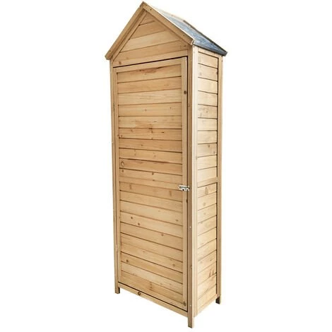 Praktischer Kiefernholzschrank, ideal zur Aufbewahrung von Werkzeugen oder Gartengeräten. Eine Hälfte hat Regale zum Aufräumen kleinerer Gegenstände und die andere Hälfte ist offen für die Aufbewahrung größerer oder längerer Utensilien wie Besen, Schaufeln usw. Es hat eine Falttür und ein Schloss. Das Dach ist sattelförmig und mit einer wasserdichten Asphaltfolie bedeckt, die die Ableitung des Wassers erleichtert. Seine Hauptmerkmale sind: – Außenmaße insgesamt: 35 x 70 x 177 cm. – Sockel: 31 x 62 x 177 cm. – Int. 28 x 59 x 172 cm. – Dach mit einem klassischen Satteldach Design. – Kiefernholz behandelt und mit wasserfester Farbe überzogen. – Gewicht: 19 kg. – Es hat ein Metallschloss. * Wir empfehlen zusätzlichen Platz, da die Maße aufgrund der Beschaffenheit des Holzes nur ungefähr sind.