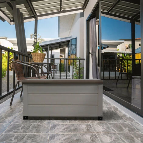 Truhe aus Harz für den Innen- und Außenbereich. Er hat ein Fassungsvermögen von 150 Litern und bietet Platz für alles, was Sie brauchen. Sie ist aus hochwertigem PVC gefertigt, das UV- und witterungsbeständig ist. Er verfügt über einen Gasfederverschluss am oberen Deckel und einen gefliesten WPC-Boden, um einen direkten Kontakt mit der Feuchtigkeit des Bodens zu vermeiden. Dank seines geringen Gewichts kann er mühelos an verschiedene Orte gebracht werden. Diese Aufbewahrungslösung ist wartungsfrei, einfach zu montieren, leicht zu reinigen und die Wände können gestrichen werden, um der Truhe einen persönlichen Stil zu verleihen.