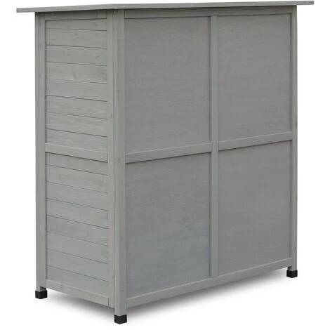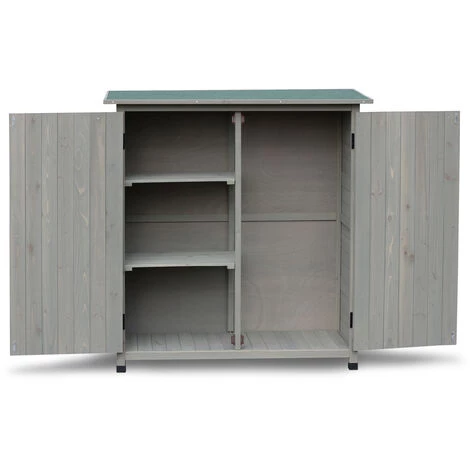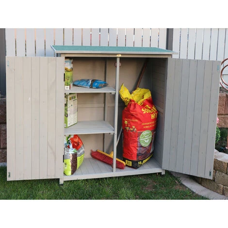 Der hellgraue Gartenschrank im Landhausstil bietet Stauraum für Gartengeräte, Grillzubehör und vieles mehr. Holzkohle, Werkzeug, Schläuche – alles kann übersichtlich untergebracht werden. Der Innenraum ist zur Stabilisierung mit einem Holzrahmen geteilt. In den Holzrahmen können jeweils halbseitig zwei Regalböden eingelegt werden. So haben Sie auch eine Ablage für kleine Gerätschaften und Zubehör.