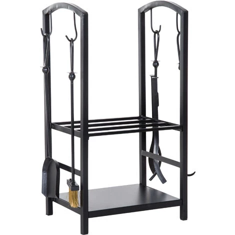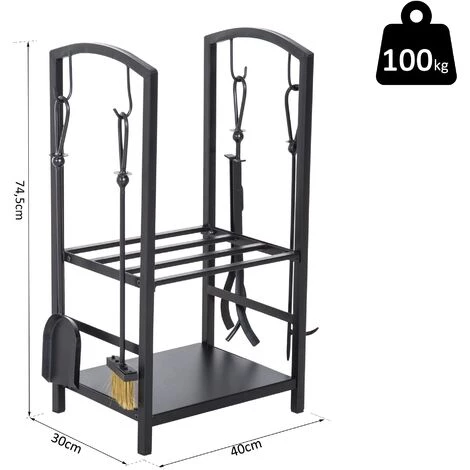 Mit unserem Kaminholzständer von HOMCOM brauchen Sie sich keine Sorgen mehr über die sichere Lagerung Ihres Brennholzes zu machen. Im rustikal angehauchten Regal können Sie Feuerholz, Kaminanzünder und weiteres Zubehör übersichtlich lagern. Dabei lässt sich Ihr Ständer mit bis zu 100kg belasten. Möglich macht dies das stabile, pulverbeschichtete Eisengestell. Zu Ihrem Brennholzregal gibt es ein 4-teiliges Kaminbesteck, bestehend aus Besen, Schaufel, Schürhaken und Zange. So schützen Sie Ihr Brennholz sicher vor Bodenfeuchtigkeit und genießen die kalten Tage entspannt.