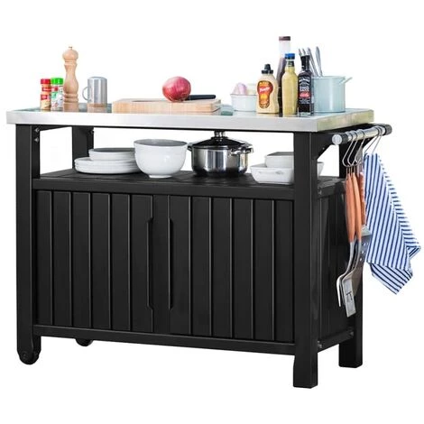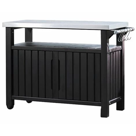 Dieser multifunktionale Grilltisch von Keter verfügt über einen Speicherplatz von 298 Litern. Die Arbeitsplatte aus Edelstahl eignet sich hervorragend für die Zubereitung von Speisen und Getränken und bietet Ihnen viel Platz zum Servieren. Der Garten-Grilltisch eignet sich bestens für Grillparties und andere Veranstaltungen im Freien.