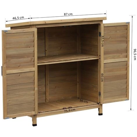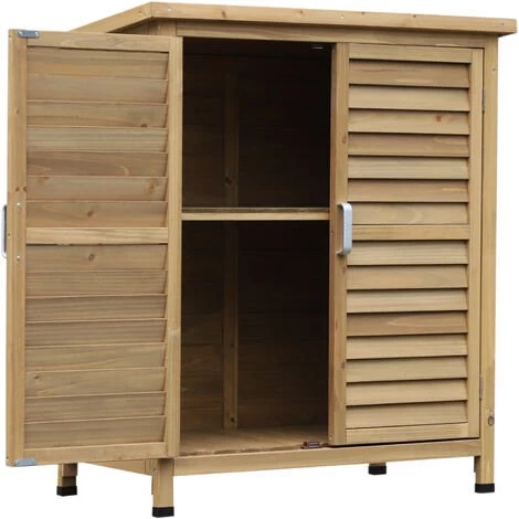Wenn auch bei Ihnen die Gartengeräte und Werkzeuge rumliegen und Platz wegnehmen, ist es Zeit, dass sie ihren eigenen Platz bekommen – in unserem Gartenhäuschen von Outsunny! Dieser Gartenschrank ist die elegante Lösung für Werkzeuge und Zubehör. In den zwei Regalfächern hinter den zwei großen Türen mit Aluminiumgriffen ist alles dezent aufbewahrt und trotzdem immer leicht zugänglich. Die Bitumenpappe auf dem Pultdach sorgt dafür, dass drinnen alles trocken bleibt. Durch die Lamellen an den Türen bleibt Ihr Geräteschrank immer gut belüftet.