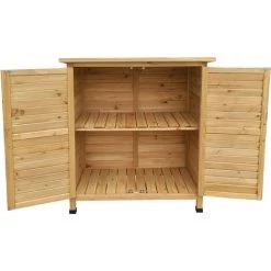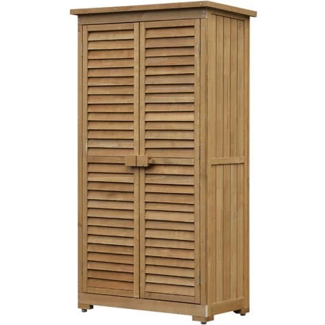 Wenn auch bei Ihnen die Gartengeräte und Werkzeuge rumliegen und Platz wegnehmen, ist es Zeit, dass sie ihren eigenen Platz bekommen – in unserem Gartenhäuschen von Outsunny! Dieser Gartenschrank ist die elegante Lösung für Werkzeuge und Zubehör. In den drei Regalfächern hinter den zwei großen Türen mit Holzgriffen ist alles dezent aufbewahrt und trotzdem immer leicht zugänglich. Die Bitumenpappe auf dem Pultdach sorgt dafür, dass drinnen alles trocken bleibt. Durch die Lamellen an den Türen bleibt Ihr Geräteschrank immer gut belüftet.