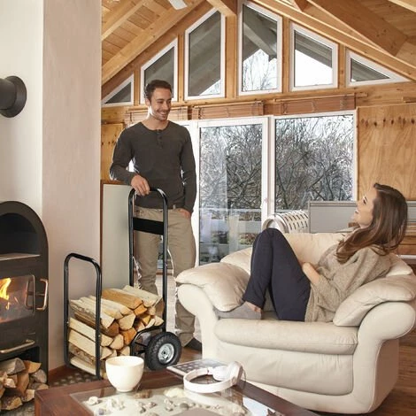 In kalten Jahreszeiten gibt es nichts Schöneres als es sich vor dem Kamin oder Ofen gemütlich zu machen. Zur Vorbereitung gehört jedoch das Heranschaffen von schwerem Feuerholz. Erleichtern Sie sich den Transport der vorbereiteten Holzscheite mit diesem Brennholzwagen. Das Kaminholz lässt sich bequem darauf stapeln und zu Ihrer Feuerstelle bringen. Die Plane können Sie zur Abdeckung des Feuerholzes als Wetterschutz verwenden. Die Holzkarre ist drinnen und draußen ein praktischer Helfer.