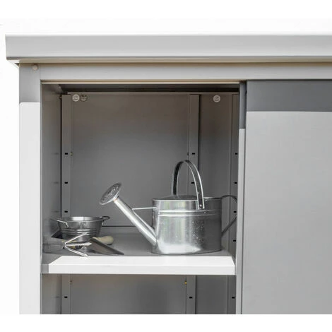 Dieses Regal aus Metall kann mit einem Gewicht von bis zu 55 kg belastet werden. Es bietet genügend Stauraum für Ihre Gerätschaften und somit eine großartige Hilfestellung bei der Organisation Ihres Gartenschrankes.