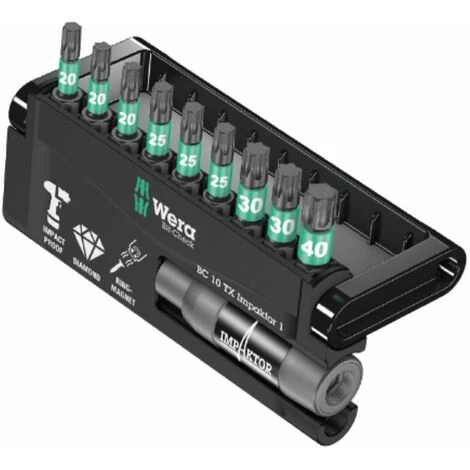 Robuster Bit-Check von Wera. Bit-Checks ermöglichen einen schnellen Überblick über das vorhandene Werkzeug. Nicht benötigte Bits werden einfach ins Sortiment zurückgesteckt und gehen nicht verloren. Einfacher Transport z.B. in der Hemdtasche. Die Impaktortechnologie sorgt für überdurchschnittliche Standzeiten auch bei extremen Anforderungen. Erhöhter Reibungswiderstand durch raue Diamantpartikelbeschichtung auf der Bitspitze verhindern das Herausrutschen aus der Schraube. Besonders geeignet für den Einsatz mit handelsüblichen Impakt-/Schlagschraubern. Impaktor Halter zur Abfederung extremer Impulsspitzen. Besonderer Torsionseffekt durch Doppeltorsionsfeder. Mit Ringmagnet zum einfachen Halten auch langer und schwerer Schrauben. ideal auch für Über-Kopf-Arbeiten. Besonders geeignet für den Einsatz mit handelsüblichen Impakt-/Schlagschraubern. Magnet kann zurückgeschoben und dadurch ausgeschaltet werden.